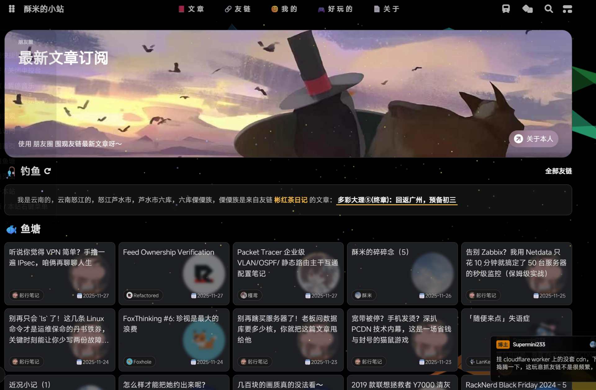 移除无用功能Tidio私聊,本功能下线前已无法正常使用,遂移除。开启Twikoo评论懒加载。新增朋友圈功能(本想使用主题自带的功能的,但Vercel部署只能使用最新版,主题无法使用新版本的朋友圈后端,遂放弃,使用官方文档的Butterfly主题方案。目前运行良好)
