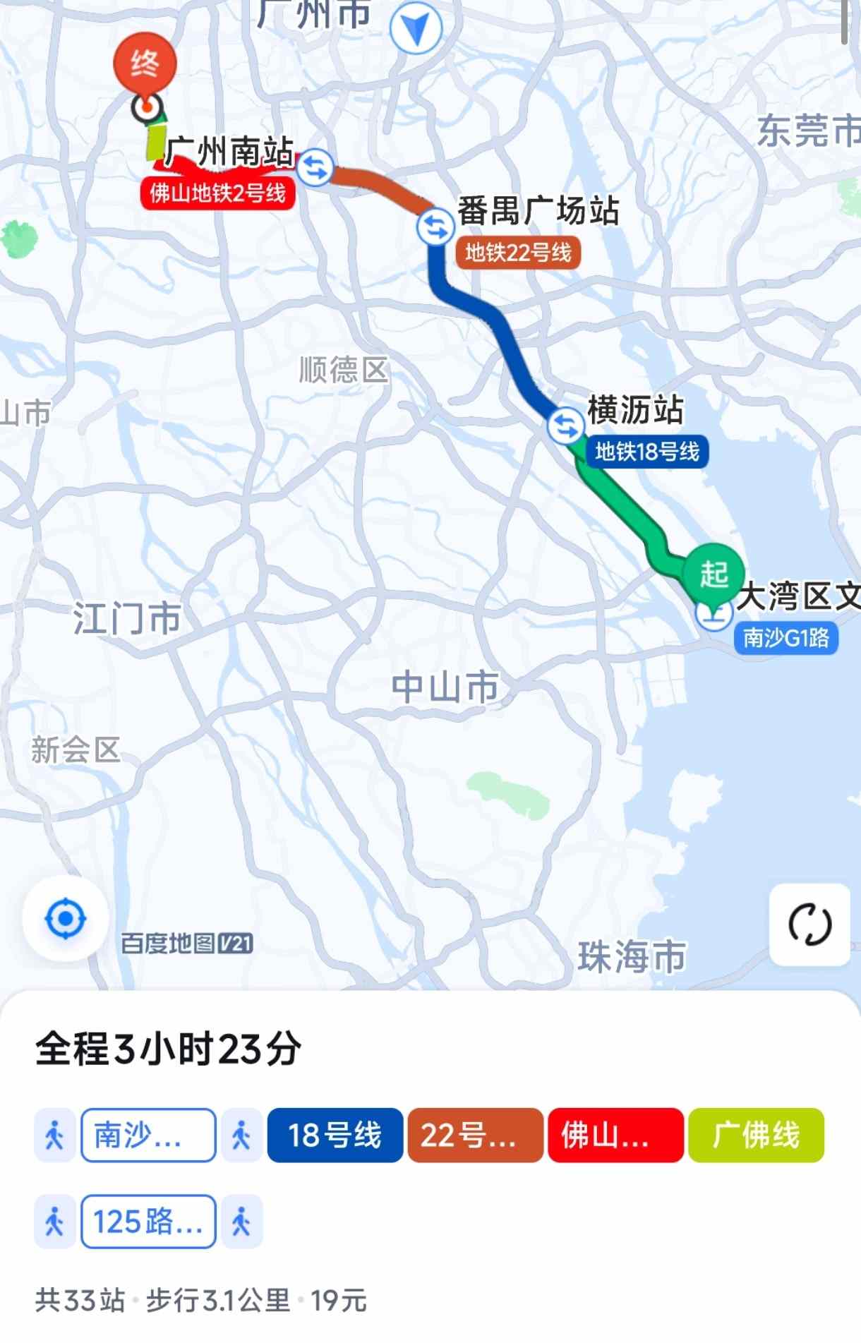 从佛山出发,需要一共3小时的车程,原计划是进入广州市区(沥滘转乘3号线换乘18号线)。