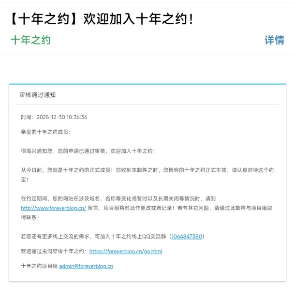 本站已于12月30日正式加入十年之约活动啦!俺很开心也很荣幸参加这个活动,本人一定会将小站坚持开下去的!