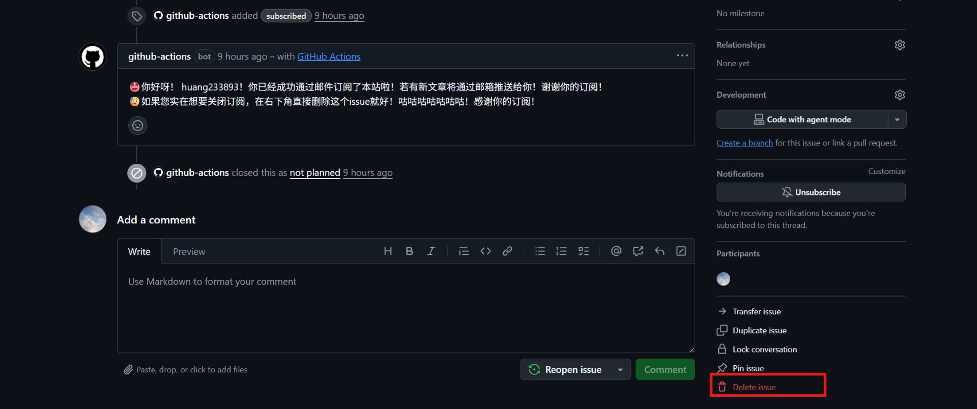 - 往下划,找到右下角“Delete issue”,点击它即可取消订阅